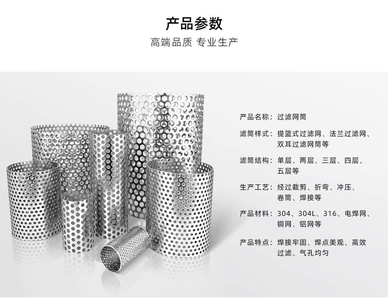 用於製(zhì)作(zuò)不鏽鋼網燒(shāo)結濾芯的燒結網一般(bān)為五層結構,分為保護層、過濾層、分離層、加強層、支撐層五部分,按照(zhào)不同的結構疊放在一起(qǐ),經過高溫真空燒結等工藝製作而成的多孔燒結(jié)材料。燒結網具有強度高,過濾性能穩定,易於加工焊接。 不鏽鋼網燒結濾芯由燒結網經過切割並整形,高精度焊接製(zhì)成燒結(jié)濾筒。燒結(jié)濾筒**主要的(de)一點是采用了大(dà)量高精度焊接工藝,燒結濾筒采用卷圓處(chù)理後進行合縫焊接。