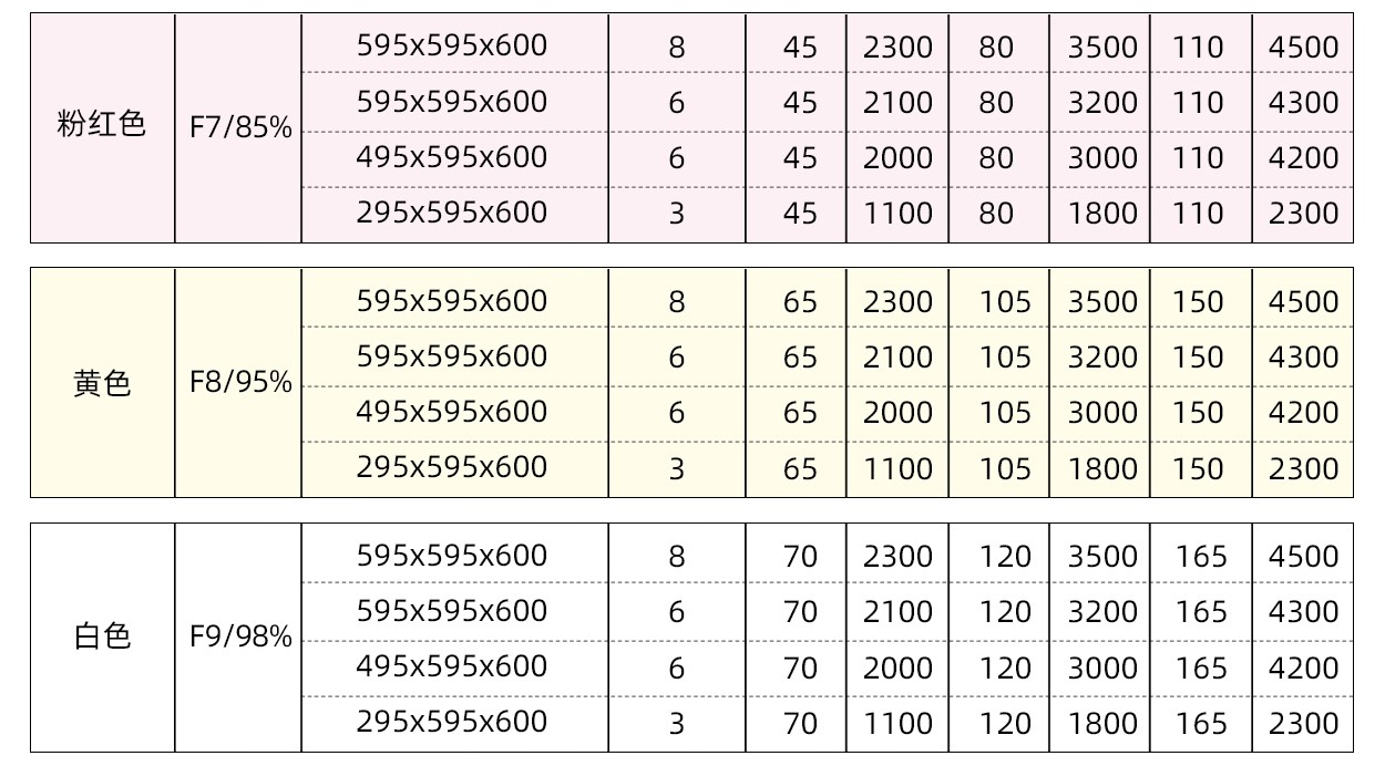 濾材由PE+PP兩種(zhǒng)化纖梯度組合,對微米粉塵過濾效率特別良好,高捕(bǔ)塵率高透氣性、高使用壽命(mìng)的特性。有35%、45%、65%、85%、95%五種效率的袋型濾網可以選擇。
